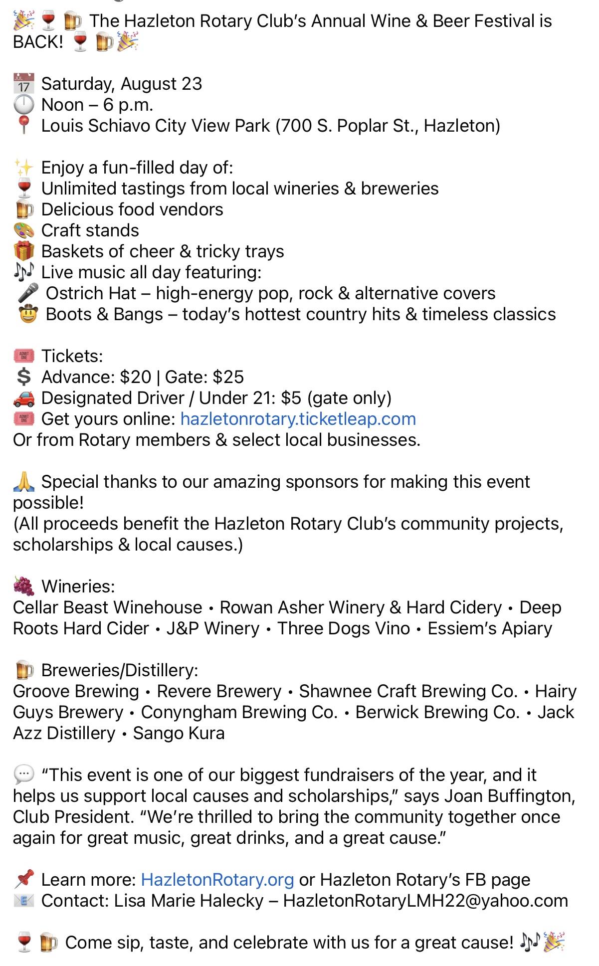 Thanks to Our Festival SponsorsThanks to Our fabulous sponsors for helping make our festival possible! It’s a great way to promote your business and support Hazleton Rotary’s community projects! ![]() |